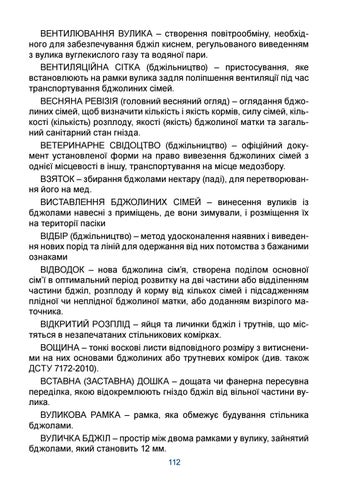 ВЕНТИЛЮВАННЯ ВУЛИКА – створення повітрообміну, необхідного для забезпечування бджіл киснем, регульованого виведенням з вулика вуглекислого газу та водяної пари. ВЕНТИЛЯЦІЙНА СІТКА (бджільництво) – пристосування, яке встановлюють на рамки вулика задля поліпшення вентиляції під час транспортування бджолиних сімей. ВЕСНЯНА РЕВІЗІЯ (головний весняний огляд) – оглядання бджолиних сімей, щоб визначити кількість і якість кормів, силу сімей, кількості (кількість) розплоду, якості (якість) бджолиної матки та загальний санітарний стан гнізда. ВЕТЕРИНАРНЕ СВІДОЦТВО (бджільництво) – офіційний документ установленої форми на право вивезення бджолиних сімей з однієї місцевості в іншу, транспортування на місце медозбору. ВЗЯТОК – збирання бджолами нектару (паді), для перетворювання його на мед. ВИСТАВЛЕННЯ БДЖОЛИНИХ СІМЕЙ – винесення вуликів із бджолами навесні з приміщень, де вони зимували, і розміщення їх на території пасіки ВІДБІР (бджільництво) – метод удосконалення наявних і виведення нових порід та ліній для одержання від них потомства з бажаними ознаками ВІДВОДОК – нова бджолина сім’я, створена поділом основної сім’ї в оптимальний період розвитку на дві частини або відділенням частини бджіл, розплоду й корму від кількох сімей і підсадженням плідної чи неплідної бджолиної матки, або доданням визрілого маточника. ВІДКРИТИЙ РОЗПЛІД – яйця та личинки бджіл і трутнів, що містяться в незапечатаних стільникових комірках. ВОЩИНА – тонкі воскові листи відповідного розміру з витисненими на них основами бджолиних або трутневих комірок (див. також ДСТУ 7172-2010). ВСТАВНА (ЗАСТАВНА) ДОШКА – дощата чи фанерна пересувна переділка, якою відокремлюють гніздо бджіл від вільної частини вулика. ВУЛИКОВА РАМКА – рамка, яка обмежує будування стільника бджолами. ВУЛИЧКА БДЖІЛ – простір між двома рамками у вулику, зайнятий бджолами, який становить 12 мм. 112