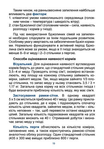 Таким чином, на ранньовесняне запилення найбільше впливають два фактори: 1. кліматичні умови навколишнього середовища (головним чином – температура і швидкість вітру); 2. стан бджолиної сім’ї (головним чином – сила, наявність розплоду і кормів у гнізді). Під час використання бджолиних сімей на запиленні необхідно слідкувати за їхнім подальшим розвитком. Особливу увагу звертають на забезпечення бджіл кормами. Нормально функціонувати в активний період бджолина сім’я може за умови, якщо в її гнізді знаходиться не менше 8–9 кг меду і 2–3 стільники з пергою. Способи оцінювання наявності кормів Візуальний. Для оцінювання наявності вуглеводних кормів беруть до уваги, що стандартний стільник уміщує 3,5–4 кг меду. Проводять огляд сім’ї, окомірно встановлюють, яку площу на кожному стільнику займають комірки, зайняті медом. Так, якщо медом зайнято 1/3 площі стільника, то запас меду у ньому становить 3,5 / 3 = 1,17 кг. Загальна сума корму на всіх стільниках гнізда і буде визначати приблизну кількість меду, яку має сім’я. Застосування рамки-сітки. В одному квадраті 5 х 5 см міститься приблизно 40 г меду. Цю рамку прикладають до стільника, де є корм, і підраховують спочатку кількість цілих квадратів, зайнятих медом, а потім – кількість неповних – так, щоб перевести останні квадрати в цілий. Загальну кількість підрахованих квадратів на усіх стільниках множать на 40 г. Отриманий добуток і визначає запас меду у гнізді. Кількість перги обчислюють за кількістю комірок, заповнених нею, а також користуючись рамкою-сіткою аналогічно обліку розплоду. Один стандартний стільник (435 Х 300 мм) вміщує приблизно 800 г перги. 19