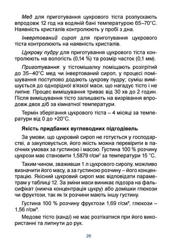 Мед для приготування цукрового тіста розпускають впродовж 12 год на водяній бані температурою 65–70°С. Наявність кристалів контролюють у пробі з дна. Інвертований сироп для приготування цукрового тіста контролюють на наявність кристалів. Цукрову пудру для приготування цукрового тіста контролюють на вологість (0,14 %) та розмір часток (0,1 мм). Приготування: у тістомішалку поміщають розігрітий до 35–40°С мед чи інвертований сироп, у процесі помішування поступово додають цукрову пудру; суміш вимішується до однорідної в’язкої маси, що нагадує тісто і не липне. Процес вимішування триває від 30 хв до 2 годин. Після вимішування тісто залишають на визрівання впродовж двох діб за кімнатної температури. Термін зберігання цукрового тіста – 4 місяці за температури від 0 до +20°С. Якість придбаних вуглеводних підгодівель За умови, що цукровий сироп не готується у господарстві, а закуповується, його якість можна перевірити в пасічних умовах за густиною і масою. Густина 100 % розчину цукрози має становити 1,5879 г/см3 за температури 15 °C. Таким чином, зваживши 1 л цукрового сиропу, можливо визначити його масу, а за густиною розчину – його концентрацію. Якісний цукровий сироп має відповідати параметрам у таблиці 12. За зміни маси виникає підозра на фальсифікат (нижча концентрація цукру) або домішки глюкози чи фруктози, так як їх розчини мають іншу густину. Густина 100 % розчину фруктози 1,69 г/см³, глюкози – 1,56 г/см³. Медове тісто (канді) не має розтікатися при його використанні та липнути до рук. 26