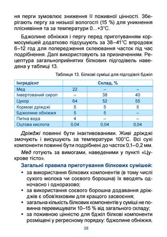 ня перги зумовлює зниження її поживної цінності. Зберігають пергу за низької вологості (15 %) для уникнення пліснявіння та за температури 0…+3°С. Бджолине обніжжя і пергу перед приготуванням кормосумішей додатково підсушують за 38–41°С впродовж 6–12 год для попередження склеювання часток під час подрібнення. Далі використовують за призначенням. Рецептура загальноприйнятих білкових підгодівель наведена у таблиці 13. Таблиця 13. Білкові суміші для підгодівлі бджіл Інгредієнт Мед Інвертований сироп Цукор Кормові дріжджі Бджолине обніжжя Питна вода Оцтова кислота