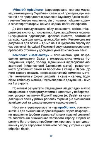«Viusid© Apiculture» (зареєстрована торгова марка, відсутня на ринку України) – іспанський препарат, призначений для природного підсилення імунітету бджіл та збагачення їхнього живлення, він стимулює поїдання корму, є гепатопротектором, не має жодних побічних ефектів. До його складу входять: яблучна кислота, аргінін, гліциризинова кислота, глюкозамін, гліцин, аскорбінова кислота, С-піридоксин гідрохлорид, фолієва кислота, пантотенат кальцію, сульфат цинку, цианокобаламін. Рекомендоване дозування для бджіл – 1,5 мл на 1 л цукрового сиропу під час весняної підгодівлі. Позитивні результати використання препарату отримані у дослідних умовах іспанських пасік. Комплекс «BeeHealthy» – призначений для покращення виживання бджіл в екстремальних умовах (голодування, стрес, холод), підвищення відтворювальної здатності (яйценосності бджолиних маток), резистентності бджолиних сімей та боротьби з кліщем Ваpоа. До його складу входить наноаквахелатний комплекс металів і неметалів у формі цитратів, а саме – селену, йоду, сірки, кобальту, магнію. Рекомендоване дозування – 8 мл на 1 л сиропу. Позитивні результати (підвищення яйцекладки матки) використання препарату отримані колегами у лабораторних умовах Інституту біології тварин (м. Львів) та семи дослідних пасік у різних регіонах України (на зменшення закліщеності та швидке весняне нарощування). Наступна група препаратів – це пробіотики, вони призначені для зміцнення здоров’я бджоли через покращення травлення (роботи середньої кишки травної системи) та запобігання виникненню харчового стресу. Наразі на ринку є багато форм пробіотичних препаратів для додавання у воду впродовж активного сезону, у корми чи для обробки бджіл. 30