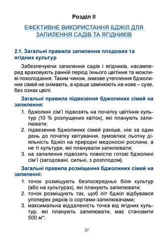 Розділ II ЕФЕКТИВНЕ ВИКОРИСТАННЯ БДЖІЛ ДЛЯ ЗАПИЛЕННЯ САДІВ ТА ЯГІДНИКІВ 2.1. Загальні правила запилення плодових та ягідних культур Забезпечуючи запилення садів і ягідників, насамперед враховують ранній період їхнього цвітіння та можливі похолодання. Таким чином, зимове утеплення бджолиних сімей не знімають, а краще замінюють на нове – сухе, без ознак цвілі. Загальні правила підвезення бджолиних сімей на запилення: 1. бджолині сім’ї підвозять на початку цвітіння культур (10 % розпущених квіток), які планують запилювати; 2. підвезення бджолиних сімей раніше, ніж за один день до початку квітування, зумовлює льотну діяльність бджіл на природні медоносні рослини, а не ті культури, які планували запилювати; 3. на запилення підвозять повністю готові бджолині сім’ї (загодовані, сильні, з розплодом). Загальні правила розміщення бджолиних сімей на запиленні: 1. точок розміщують безпосередньо біля культур (або на культурах), які планують запилювати; 2. точок розміщують так, щоб літ бджіл відбувався упоперек рядків із сортами-запилювачами; 3. максимальна віддаленість точка від ягідних культур, які планують запилювати, має становити 500 м*; 37
