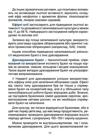 До інших ароматичних речовин, що позитивно впливають на активізацію льотної активності, відносять складний ефір неофоліон з ароматом фіалки, ліналілацетат (конвалія), піноран (жасмин садовий). Ефірні олії застосовують для підвищення льотної активності та урожайності запилювальної культури у межах від 11 до 56 %. Найширшого застосування набули коріандрова та анісова олії. Залежно від площі запилюваної культури, використовують різні види садових обприскувачів або причіпні і навісні промислові обприскувачі (наприклад, SAE, Італія). Іншим способом підвищення запилювальної діяльності медоносних бджіл є їхнє дресирування. Дресирування бджіл – технологічний прийом, спрямований на використання інстинкту бджіл на пошук кормів за запахом, смаком, кольором і місцем знаходження. Також відомі випадки дресирування бджіл на ультрафіолетове випромінювання. У Норвегії для дресирування успішно використовують ефірну олію для запилення яблуневих садів. Ефект від такого типу дресирування був не тільки у спрямуванні бджіл на конкретний вид, але й у збільшенні часу пилкозбиральної роботи бджіл впродовж доби. Власне, це підгодівля бджолиних сімей цукровим сиропом, ароматизованим квітами рослин, на які необхідно спрямувати бджіл на запилення. Для культур, які погано відвідуються бджолами, або в цей час поряд цвіте вид, що має вищу продуктивність, рекомендовано проводити дресирування впродовж всього періоду цвітіння, з розрахунку 100–150 г сиропу щоденно. Можна проводити як внутрішньовуликове, так і позавуликове дресирування. Для цього ароматизований си43