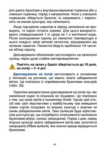 роп дають бджолам у внутрішньовуликові годівниці або у зовнішні годівниці, поряд з напувалкою. Коли у зовнішніх годівницях зберуться бджоли, їх накривають і переносять на масив культури, яку запилюють. Якщо підгодівлю сиропом в період запилення не проводять, то сироп готують окремо. Для цього використовують співвідношення 1 кг цукру на 1 л кип’яченої води. Після охолодження сиропу до кімнатної температури в нього кладуть свіжі квіткові пелюстки, відокремлені від зелених чашечок. Пелюсток беруть приблизно 1/4 частини об’єму сиропу. Дресирування обов’язково застосовують на запиленні суниць через дуже слабке нектаровиділення. Пам’ять на запах у бджіл зберігається до 10 днів, на колір – 3–4 дні. Дресирування на колір застосовують в основному у теплицях на рослини, що мають жовте забарвлення квіток. Це пов’язано із сприйманням бджолами кольорів (табл. 20). Практики використання дресирування на колір під час запилення садів та ягідників не поширені. Це пов’язано з тим, що колір квітів в основному білий. Однак цей спосіб має свої перспективи у майбутньому при виведенні нових сортів плодових та ягідних культур з жовтим чи синім забарвленням квітів. Така селекція буде ефективною для культур, що потребують інтенсивного насичення бджолами (аґрус, суниці, смородина). Поряд з цим, серед ягідних культур жовте забарвлення квітів має золотиста смородина (Ribes aureum), яка значно краще відвідується бджолами.