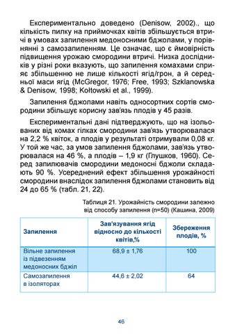 Експериментально доведено (Denisow, 2002)., що кількість пилку на приймочках квітів збільшується втричі в умовах запилення медоносними бджолами, у порівнянні з самозапиленням. Це означає, що є ймовірність підвищення урожаю смородини втричі. Низка дослідників у різні роки вказують, що запилення комахами сприяє збільшенню не лише кількості ягід/грон, а й середньої маси ягід (McGregor, 1976; Free, 1993; Szklanowska & Denisow, 1998; Kołtowski et al., 1999). Запилення бджолами навіть односортних сортів смородини збільшує корисну зав’язь плодів у 45 разів. Експериментальні дані підтверджують, що на ізольованих від комах гілках смородини зав’язь утворювалася на 2,2 % квіток, а плодів у результаті отримували 0,08 кг. У той же час, за умов запилення бджолами, зав’язь утворювалася на 46 %, а плодів – 1,9 кг (Глушков, 1960). Серед запилювачів смородини медоносні бджоли складають 90 %. Усереднений ефект збільшення урожайності смородини внаслідок запилення бджолами становить від 24 до 65 % (табл. 21, 22). Таблиця 21. Урожайність смородини залежно від способу запилення (n=50) (Кашина, 2009) Зав’язування ягід відносно до кількості квітів,%