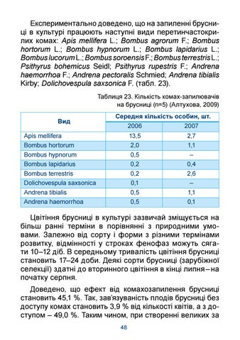 Експериментально доведено, що на запиленні брусниці в культурі працюють наступні види перетинчастокрилих комах: Apis mellifera L.; Bombus agrorum F.; Bombus hortorum L.; Bombus hypnorum L.; Bombus lapidarius L.; Bombus lucorum L.; Bombus soroensis F.; Bombus terrestris L.; Psithyrus bohemicus Seidl; Psithyrus rupestris F.; Andrena haemorrhoa F.; Andrena pectoralis Schmied; Andrena tibialis Kirby; Dolichovespula saxsonica F. (табл. 23). Таблиця 23. Кількість комах-запилювачів на брусниці (n=5) (Aлтухова, 2009) Вид