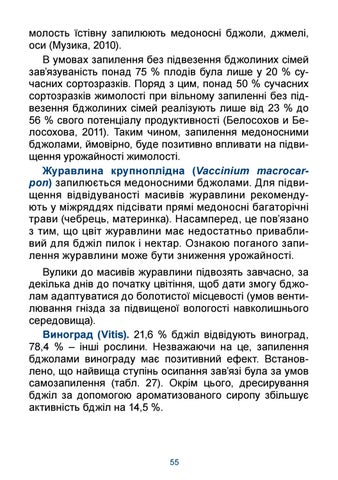 молость їстівну запилюють медоносні бджоли, джмелі, оси (Музика, 2010). В умовах запилення без підвезення бджолиних сімей зав’язуваність понад 75 % плодів була лише у 20 % сучасних сортозразків. Поряд з цим, понад 50 % сучасних сортозразків жимолості при вільному запиленні без підвезення бджолиних сімей реалізують лише від 23 % до 56 % свого потенціалу продуктивності (Белосохов и Белосохова, 2011). Таким чином, запилення медоносними бджолами, ймовірно, буде позитивно впливати на підвищення урожайності жимолості. Журавлина крупноплідна (Vaccinium macrocarpon) запилюється медоносними бджолами. Для підвищення відвідуваності масивів журавлини рекомендують у міжряддях підсівати прямі медоносні багаторічні трави (чебрець, материнка). Насамперед, це пов’язано з тим, що цвіт журавлини має недостатньо привабливий для бджіл пилок і нектар. Ознакою поганого запилення журавлини може бути зниження урожайності. Вулики до масивів журавлини підвозять завчасно, за декілька днів до початку цвітіння, щоб дати змогу бджолам адаптуватися до болотистої місцевості (умов вентилювання гнізда за підвищеної вологості навколишнього середовища). Виноград (Vitis). 21,6 % бджіл відвідують виноград, 78,4 % – інші рослини. Незважаючи на це, запилення бджолами винограду має позитивний ефект. Встановлено, що найвища ступінь осипання зав’язі була за умов самозапилення (табл. 27). Окрім цього, дресирування бджіл за допомогою ароматизованого сиропу збільшує активність бджіл на 14,5 %.