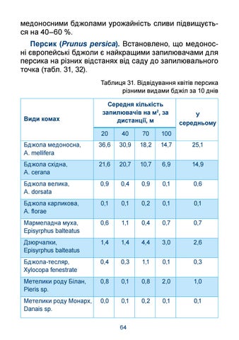 медоносними бджолами урожайність сливи підвищується на 40–60 %. Персик (Prunus persica). Встановлено, що медоносні європейські бджоли є найкращими запилювачами для персика на різних відстанях від саду до запилювального точка (табл. 31, 32). Таблиця 31. Відвідування квітів персика різними видами бджіл за 10 днів