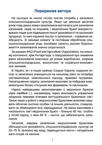Передмова автора На сьогодні як ніколи гостро постає потреба у запиленні сільськогосподарських культур. Якщо ще декілька десятків років тому диких комах запилювачів вистачало для запилення насінників, садів чи ягідників, і медоносних бджіл використовували лише для підвищення їхньої урожайності та насіннєвої продукції, то нині надання послуг із запилення – справжня необхідність. Зі змінами клімату та постійним обробітком сільськогосподарських угідь засобами захисту рослин біорізноманіття запилювачів значно скоротилося. За даними ФАО (Food and Agriculture Organization), на кожному континенті, крім Антарктиди, є повідомлення про зниження рівня запилювачів внаслідок дії різних виробничих, зокрема сільськогосподарських, екологічних та соціально-економічних чинників. В Україні, як і в інших країнах Східної Європи, надання послуг із запилення знаходиться на низькому рівні та потребує систематизації, комплексного підходу, правової підтримки. Налагодження сервісу запилення можливе за побудови взаємовигідних бізнес-стосунків між фермером та пасічником. Наразі найкращими запилювачами є медоносні бджоли (Apis mellifera L.), насамперед через можливість управління людиною певними етапами життєдіяльності бджолиної сім’ї. Також лише у роботі з медоносними бджолами можливо керувати обсягом льотних особин та їхньою діяльністю, стимулювати чи обмежувати їхнє нарощування. Не менш важливим є чисельність сім’ї медоносних бджіл – близько 80 тис. особин у літній період, з яких 60 % – льотні, що забезпечують запилення. Загалом, завдяки запиленню медоносними бджолами збільшується урожайність сільськогосподарських культур на 20–75 % залежно від виду, підвищується якість і натуральна вага плодів та насіння. 7