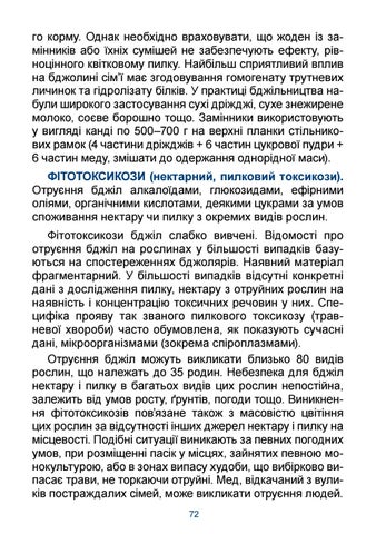 го корму. Однак необхідно враховувати, що жоден із замінників або їхніх сумішей не забезпечують ефекту, рівноцінного квітковому пилку. Найбільш сприятливий вплив на бджолині сім’ї має згодовування гомогенату трутневих личинок та гідролізату білків. У практиці бджільництва набули широкого застосування сухі дріжджі, сухе знежирене молоко, соєве борошно тощо. Замінники використовують у вигляді канді по 500–700 г на верхні планки стільникових рамок (4 частини дріжджів + 6 частин цукрової пудри + 6 частин меду, змішати до одержання однорідної маси). ФІТОТОКСИКОЗИ (нектарний, пилковий токсикози). Отруєння бджіл алкалоїдами, глюкозидами, ефірними оліями, органічними кислотами, деякими цукрами за умов споживання нектару чи пилку з окремих видів рослин. Фітотоксикози бджіл слабко вивчені. Відомості про отруєння бджіл на рослинах у більшості випадків базуються на спостереженнях бджолярів. Наявний матеріал фрагментарний. У більшості випадків відсутні конкретні дані з дослідження пилку, нектару з отруйних рослин на наявність і концентрацію токсичних речовин у них. Специфіка прояву так званого пилкового токсикозу (травневої хвороби) часто обумовлена, як показують сучасні дані, мікроорганізмами (зокрема спіроплазмами). Отруєння бджіл можуть викликати близько 80 видів рослин, що належать до 35 родин. Небезпека для бджіл нектару і пилку в багатьох видів цих рослин непостійна, залежить від умов росту, ґрунтів, погоди тощо. Виникнення фітотоксикозів пов’язане також з масовістю цвітіння цих рослин за відсутності інших джерел нектару і пилку на місцевості. Подібні ситуації виникають за певних погодних умов, при розміщенні пасік у місцях, зайнятих певною монокультурою, або в зонах випасу худоби, що вибірково випасає трави, не торкаючи отруйні. Мед, відкачаний з вуликів постраждалих сімей, може викликати отруєння людей. 72