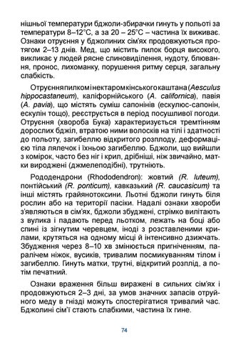 нішньої температури бджоли-збирачки гинуть у польоті за температури 8–12°С, а за 20 – 25°С – частина їх виживає. Ознаки отруєння у бджолиних сім’ях продовжуються протягом 2–13 днів. Мед, що містить пилок борця високого, викликає у людей рясне слиновиділення, нудоту, блювання, пронос, лихоманку, порушення ритму серця, загальну слабкість. Отруєння пилком і нектаром кінського каштана (Aesculus hippocastaneum), каліфорнійського (A. californica), павія (A. pavia), що містять суміш сапонінів (ескулюс-сапонін, ескулін тощо), реєструється в період посушливої погоди. Отруєння (хвороба Бука) характеризується тремтінням дорослих бджіл, втратою ними волосків на тілі і здатності до польоту, загибеллю відкритого розплоду, деформацією тіла лялечок і їхньою загибеллю. Бджоли, що вийшли з комірок, часто без ніг і крил, дрібніші, ніж звичайно, матки вироджені (джмелеподібні), трутніють. Рододендрони (Rhododendron): жовтий (R. luteum), понтійський (R. ponticum), кавказький (R. caucasicum) та інші містять грайянотоксини. Льотні бджоли гинуть біля рослин або на території пасіки. Надалі ознаки хвороби з’являються в сім’ях, бджоли збуджені, стрімко вилітають з вулика і падають перед льотком, лежать на боці або спині із зігнутим черевцем, іноді з розставленими крилами, крутяться на одному місці й інтенсивно дзижчать. Збудження через 8–10 хв змінюється пригніченням, паралічем ніжок, вусиків, тривалим посмикуванням тілом і загибеллю. Гинуть матки, трутні, відкритий розплід, а потім печатний. Ознаки враження більш виражені в сильних сім’ях і продовжуються 2–3 дні, за умов значних запасів отруйного меду в гнізді можуть спостерігатися тривалий час. Бджолині сім’ї стають слабкими, частина їх гине. 74