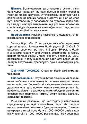 Діагноз. Встановлюють за ознаками отруєння: загибель через тривалий час після настання змін у поведінці (частина бджіл видужує). Фітотоксикози реєструються в період цвітіння певних рослин. Остаточний діагноз може бути поставлений у лабораторії: за будовою зерен пилку з меду і нектару визначають вид рослини, проводять спеціальні дослідження на алкалоїди, глюкозиди, виключають інфекційні захворювання. Профілактика. Навколо пасіки сіють медоноси, створюють цілорічний конвеєр. Заходи боротьби. У постраждалих сім’ях видаляють кормові запаси, підгодовують бджіл рідким (1 : 2 або 1 : 3) цукровим сиропом протягом 1–2 днів. Збирають бджіл з ознаками паралічу біля вуликів, розсипають їх тонким шаром (близько 0,5 см) у ящик і вносять в тепле (22–25°С) приміщення. У міру відновлення здатності бджіл до польоту їх випускають. Дресирують бджіл на неотруйні рослини. ХІМІЧНИЙ ТОКСИКОЗ. Отруєння бджіл хімічними речовинами. Етіологічні дані. Отруєння бджіл токсичними речовинами пов’язане в основному із широким використанням пестицидів для боротьби зі шкідниками сільськогосподарських культур, з промисловими викидами різних підприємств, рідше – із застосуванням забрудненого солями (в основному хлористим натрієм) цукру на корм бджолам (сольовий токсикоз). Різні хімічні речовини, що надходять у навколишнє середовище у вигляді газоподібних, рідких або твердих часток, звичайно заносяться бджолами у вулик, і їхня концентрація в гнізді може бути в 1000–100000 разів вища, ніж у повітрі, і в 1000–10000 разів вища, ніж у рослинах. 75