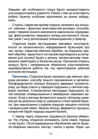 Завдяки цій особливості гнізда бджіл використовують для екомоніторингу довкілля. Разом з тим ця властивість робить бджолу особливо вразливою до різних забруднень. Ступінь і характер прояву отруєнь залежать від кількості, хімічних і фізичних властивостей речовин, способів, умов і термінів їхнього внесення в навколишнє середовище, фази розвитку і видового складу рослинності, погодних умов і часу детоксикації (знешкодження) у природі. Отруєння бджіл пестицидами звичайно спостерігаються за несвоєчасного інформування бджолярів про час, місце і характер хімічних обробок, за порушень правил обробки, відсутності на пасіках відповідного устаткування для ізоляції бджіл у вулику, несвоєчасному перевезенні сімей бджіл у безпечне місце. Причиною отруєнь можуть бути і неправильне зберігання отрутохімікатів, недобросовісна робота під час приготування робочих розчинів пестицидів. Патогенез. Отруєння бджіл залежить від хімічної природи речовин, способу їхнього проникнення в організм. Фосфорорганічні сполуки блокують фермент холінестеразу, що бере участь у передачі порушень у гангліях нервової системи. Хлорорганічні пестициди порушують калій-натрієве співвідношення в мембранах нервових волокон. Фтор у вигляді фтористого водню і фториду кремнію діє як дихальна отрута, руйнуючи стінки трахей бджоли, при надходженні з кормом порушує процеси гліколізу і мінеральний обмін. Миш’як блокує ферментні процеси, хлористий барій порушує водний баланс. У першу чергу отруєнню піддаються бджоли-збирачки. На ступінь отруєння впливають сила сімей, порода та вік бджіл. Після відвідування оброблених квіток бджоли-збирачки заносять нектар і пилок у вулик. Корм, що 76