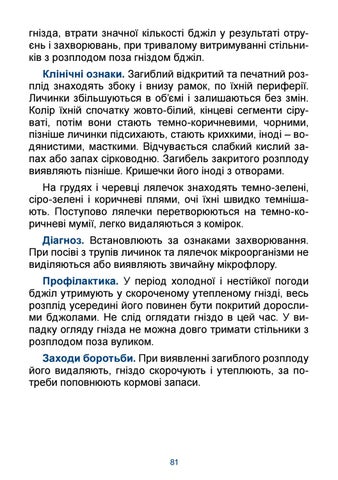 гнізда, втрати значної кількості бджіл у результаті отруєнь і захворювань, при тривалому витримуванні стільників з розплодом поза гніздом бджіл. Клінічні ознаки. Загиблий відкритий та печатний розплід знаходять збоку і внизу рамок, по їхній периферії. Личинки збільшуються в об’ємі і залишаються без змін. Колір їхній спочатку жовто-білий, кінцеві сегменти сіруваті, потім вони стають темно-коричневими, чорними, пізніше личинки підсихають, стають крихкими, іноді – водянистими, масткими. Відчувається слабкий кислий запах або запах сірководню. Загибель закритого розплоду виявляють пізніше. Кришечки його іноді з отворами. На грудях і черевці лялечок знаходять темно-зелені, сіро-зелені і коричневі плями, очі їхні швидко темнішають. Поступово лялечки перетворюються на темно-коричневі мумії, легко видаляються з комірок. Діагноз. Встановлюють за ознаками захворювання. При посіві з трупів личинок та лялечок мікроорганізми не виділяються або виявляють звичайну мікрофлору. Профілактика. У період холодної і нестійкої погоди бджіл утримують у скороченому утепленому гнізді, весь розплід усередині його повинен бути покритий дорослими бджолами. Не слід оглядати гніздо в цей час. У випадку огляду гнізда не можна довго тримати стільники з розплодом поза вуликом. Заходи боротьби. При виявленні загиблого розплоду його видаляють, гніздо скорочують і утеплюють, за потреби поповнюють кормові запаси.