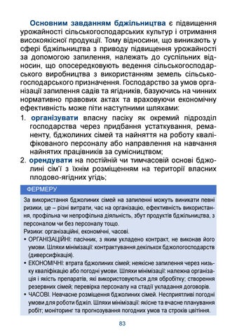 Основним завданням бджільництва є підвищення урожайності сільськогосподарських культур і отримання високоякісної продукції. Тому відносини, що виникають у сфері бджільництва з приводу підвищення урожайності за допомогою запилення, належать до суспільних відносин, що опосередковують ведення сільськогосподарського виробництва з використанням земель сільськогосподарського призначення. Господарство за умов організації запилення садів та ягідників, базуючись на чинних нормативно правових актах та враховуючи економічну ефективність може піти наступними шляхами: 1. організувати власну пасіку як окремий підрозділ господарства через придбання устаткування, реманенту, бджолиних сімей та найняття на роботу кваліфікованого персоналу або направлення на навчання найнятих працівників за сумісництвом; 2. орендувати на постійній чи тимчасовій основі бджолині сім’ї з їхнім розміщенням на території власних плодово-ягідних угідь; ФЕРМЕРУ За використання бджолиних сімей на запиленні можуть виникати певні ризики, це – різні витрати, час на організацію, ефективність використання, профільна чи непрофільна діяльність, збут продуктів бджільництва, з персоналом чи без персоналу тощо. Ризики: організаційні, економічні, часові. y ОРГАНІЗАЦІЙНІ: пасічник, з яким укладено контракт, не виконав його умови. Шляхи мінімізації: контрактування декількох бджологосподарств (диверсифікація). y ЕКОНОМІЧНІ: втрата бджолиних сімей; неякісне запилення через низьку кваліфікацію або погодні умови. Шляхи мінімізації: належна організація і якість препаратів, які використовуються для обробітку; створення резервних сімей; перевірка персоналу на стадії укладання договорів. y ЧАСОВІ. Невчасне розміщення бджолиних сімей. Несприятливі погодні умови для роботи бджіл. Шляхи мінімізації: якісне та вчасне планування робіт; моніторинг та прогнозування погодних умов та строків цвітіння. 83