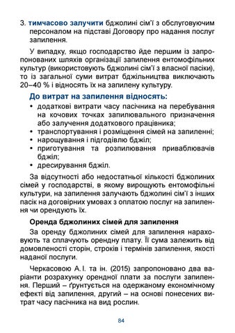 y додаткові витрати часу пасічника на перебування на кочових точках запилювального призначення або залучення додаткового працівника; y транспортування і розміщення сімей на запиленні; y нарощування і підгодівлю бджіл; y приготування та розпилювання приваблювачів бджіл; y дресирування бджіл. За відсутності або недостатньої кількості бджолиних сімей у господарстві, в якому вирощують ентомофільні культури, на запилення залучають бджолині сім’ї з інших пасік на договірних умовах з оплатою послуг на запилення чи орендують їх. Оренда бджолиних сімей для запилення За оренду бджолиних сімей для запилення нараховують та сплачують орендну плату. Її сума залежить від домовленості сторін, строків і термінів запилення, якості наданої послуги. Черкасовою А. І. та ін. (2015) запропоновано два варіанти розрахунку орендної плати за послуги запилення. Перший – ґрунтується на одержаному економічному ефекті від запилення, другий – на основі понесених витрат часу пасічника на вид рослин. 84