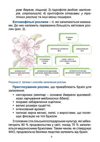 Пристосування рослин, що приваблюють бджіл для запилення: y нектарники (нектар – основне джерело вуглеводного харчування медоносних бджіл); y яскраве забарвлення оцвітини; y великі розміри суцвіття; y інтенсивний аромат; y пилкові зерна великі, липкі, з виростами, що полегшує фіксацію на тілі бджоли. З головних ста сільськогосподарських культур, які забезпечують 90 % продовольства у світі, понад 75 % запилюються медоносними бджолами. Таким чином, як стверджує ФАО, продовольча безпека людства залежить від бджіл. 9