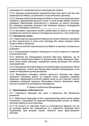 у відповідності з вимогами діючого законодавства України. 5.1.13. Орендар незобов’язаний повідомляти будь-яких третіх осіб про свої права відносно Майна, що виникають на підставі даного Договору. 5.1.14. Орендар зобов’язаний повернути Майно в тому стані в якому воно було отримано з урахуванням фізичного зносу та Актів огляду Майна. Кількість отриманих бджолосімей визначається в додатках до даного Договору. Всі отриманні додатково бджолині сім’ї внаслідок ведення господарської діяльності Орендаря є власністю ____________________. 5.1.15. Все майно, транспортні засоби, засоби праці та захисту, які Орендар придбав для належного ведення господарської діяльності, є його власністю. 5.2. Орендар має право: 5.2.1. Користуватися орендованим Майном без усяких обмежень відповідно до його призначення та умов цього Договору без права передачі майна іншим особам в суборенду. 5.2.2. Мати вільний 24-годинний доступ до Майна та території, на якому воно розміщено. 5.2.3. Встановлювати охоронне обладнання та пости охорони на території на власний розсуд. 5.2.4. Вимагати від Орендодавця усунення будь-яких перешкод, що не дозволяють використання Майно за призначенням та/або обмежують будьяким чином права Орендаря, передбачені даним Договором або діючим законодавством. 5.2.5. Орендар має безспірне право не оплачувати будь-які додаткові платежі чи відшкодування, оплати яких безпідставно вимагає Орендодавець та які прямо не передбачені даним Договором. 5.2.6. Враховуючи специфіку ведення діяльності Орендар має право проводити селекційну роботу на товарній пасіці, продавати отриману продукцію, переміщувати (кочівля) товарну пасіку на інші території з метою отримання необхідної продукції, збільшувати кількість бджолиних сімей, залучати спеціалістів для ведення господарства. 6. Права та обов’язки Орендодавця 6.1. Орендодавець зобов’язується: 6.1.1. Повідомити Орендаря про зміни в юридичних або банківських реквізитах. 6.1.2. Забезпечити Орендарю та його працівникам будь-яким третім особам пов’язаним з Орендарем 24-годинний безперешкодний доступ до Майна протягом терміну дії цього Договору. 6.1.3. Не входити на територію пасіки та господарських будівель під час дії договору оренди без повідомлення та у відсутність Орендаря (його Працівників), крім випадків пожежі, наявності інших форс-мажорних обставин.