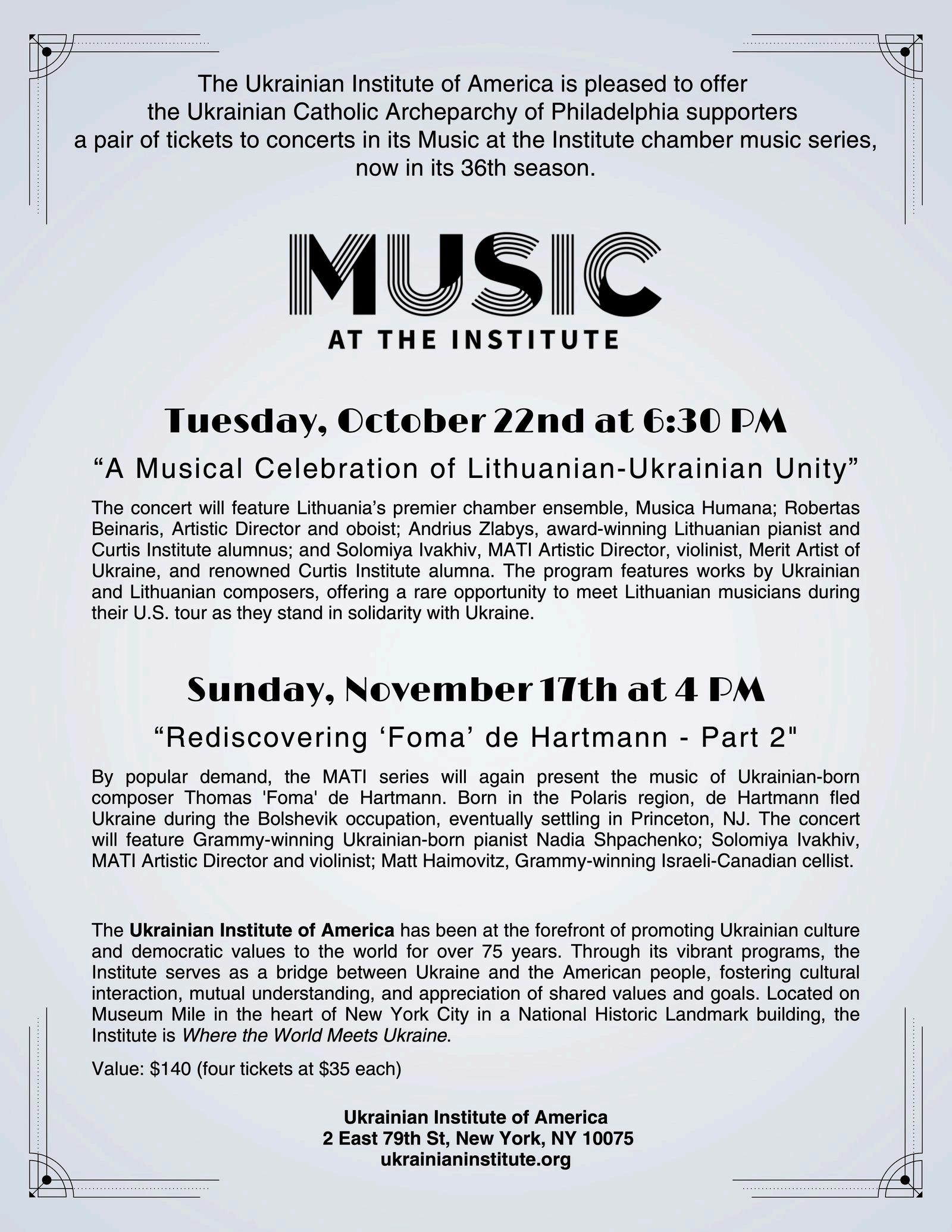 The Ukrainian Institute of America has been at the forefront of promoting Ukrainian culture and democratic values to the world for over 75 years Through its vibrant programs, the Institute serves as a bridge between Ukraine and the American people, fostering cultural interaction, mutual understanding, and appreciation of shared values and goals. Located on Museum Mile in the heart of New York City in a National Historic Landmark building, the Institute is Where the World Meets Ukraine.