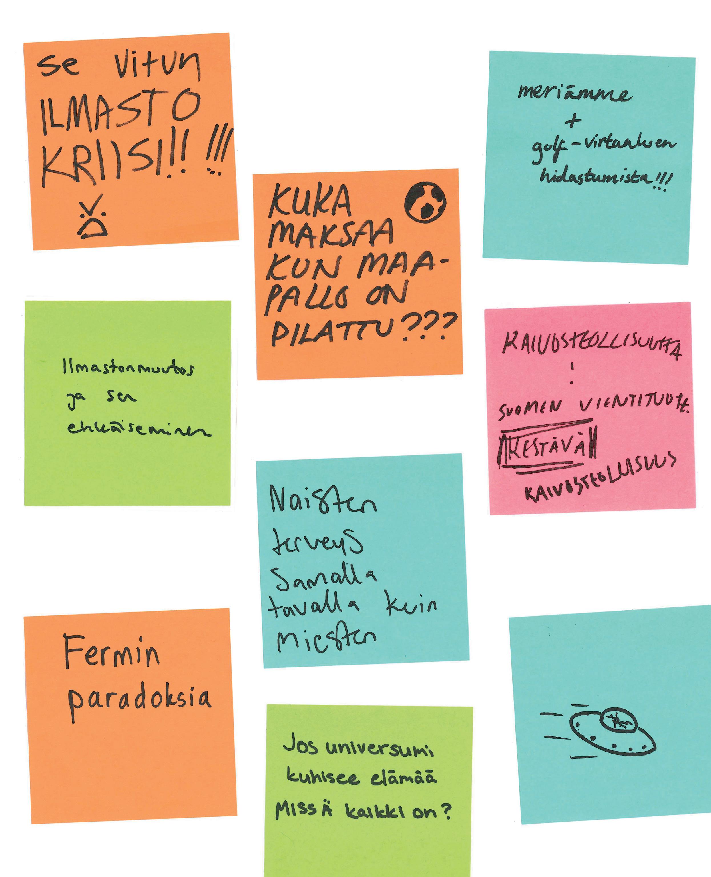 Kide-lehti kysyi yliopistolaisilta tärkeitä tutkimusaiheita gallupissa, johon pystyi vastaamaan post it -lapuilla yliopiston pääkampuksen käytävällä noin viikon ajan helmikuussa. Tässä osa vastauksista.