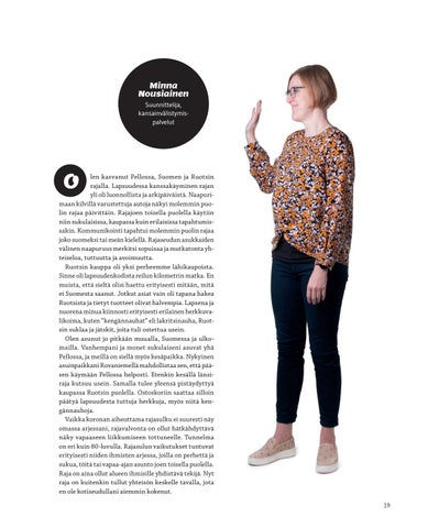 len kasvanut Pellossa, Suomen ja Ruotsin rajalla. Lapsuudessa kanssakäyminen rajan yli oli luonnollista ja arkipäiväistä. Naapurimaan kilvillä varustettuja autoja näkyi molemmin puolin rajaa päivittäin. Rajajoen toisella puolella käytiin niin sukulaisissa, kaupassa kuin erilaisissa tapahtumissakin. Kommunikointi tapahtui molemmin puolin rajaa joko suomeksi tai meän kielellä. Rajaseudun asukkaiden välinen naapuruus merkitsi sopuisaa ja mutkatonta yhteiseloa, tuttuutta ja avoimuutta. Ruotsin kauppa oli yksi perheemme lähikaupoista. Sinne oli lapsuudenkodista reilun kilometrin matka. En muista, että sieltä olisi haettu erityisesti mitään, mitä ei Suomesta saanut. Jotkut asiat vain oli tapana hakea Ruotsista ja tietyt tuotteet olivat halvempia. Lapsena ja nuorena minua kiinnosti erityisesti erilainen herkkuvalikoima, kuten ”kengännauhat” eli lakritsinauha, Ruotsin suklaa ja jätskit, joita tuli ostettua usein. Olen asunut jo pitkään muualla, Suomessa ja ulkomailla. Vanhempani ja monet sukulaiseni asuvat yhä Pellossa, ja meillä on siellä myös kesäpaikka. Nykyinen asuinpaikkani Rovaniemellä mahdollistaa sen, että pääsen käymään Pellossa helposti. Etenkin kesällä länsiraja kutsuu usein. Samalla tulee yleensä pistäydyttyä kaupassa Ruotsin puolella. Ostoskoriin saattaa silloin päätyä lapsuudesta tuttuja herkkuja, myös niitä kengännauhoja. Vaikka koronan aiheuttama rajasulku ei suuresti näy omassa arjessani, rajavalvonta on ollut hätkähdyttävä näky vapaaseen liikkumiseen tottuneelle. Tunnelma on eri kuin 80-luvulla. Rajasulun vaikutukset tuntuvat erityisesti niiden ihmisten arjessa, joilla on perhettä ja sukua, töitä tai vapaa-ajan asunto joen toisella puolella. Raja on aina ollut alueen ihmisille yhdistävä tekijä. Nyt raja on kuitenkin tullut yhteisön keskelle tavalla, jota en ole kotiseudullani aiemmin kokenut. i