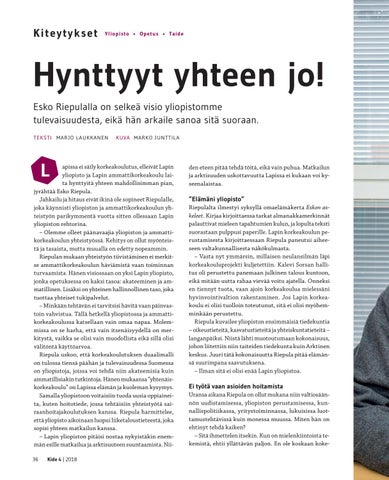 Hynttyyt yhteen jo! Esko Riepulalla on selkeä visio yliopistomme tulevaisuudesta, eikä hän arkaile sanoa sitä suoraan. TE K STI MARJO LAU K K AN EN