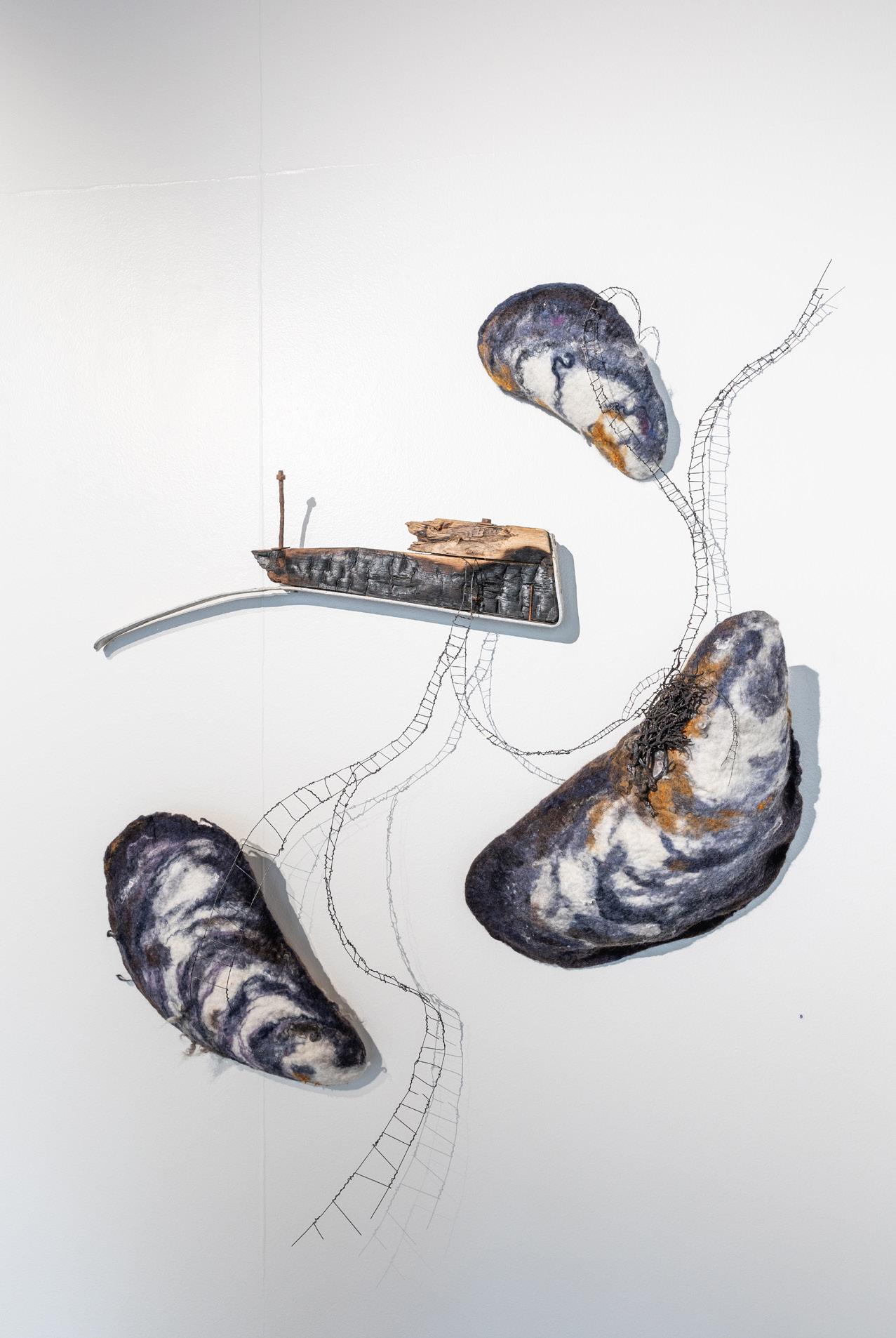 Rantautumisia tekee näkyväksi niitä hiljaisia hetkiä, jolloin jotain nousee pintaan: muisto, tunne tai mereltä saapunut esine. Teos rakentuu Pohjois-Norjan rannoilta löytyneistä aarteista ja merellisistä aineksista – ajopuusta sekä simpukoista, inspiroituneista muodoista, joita villalla tulkitsen.