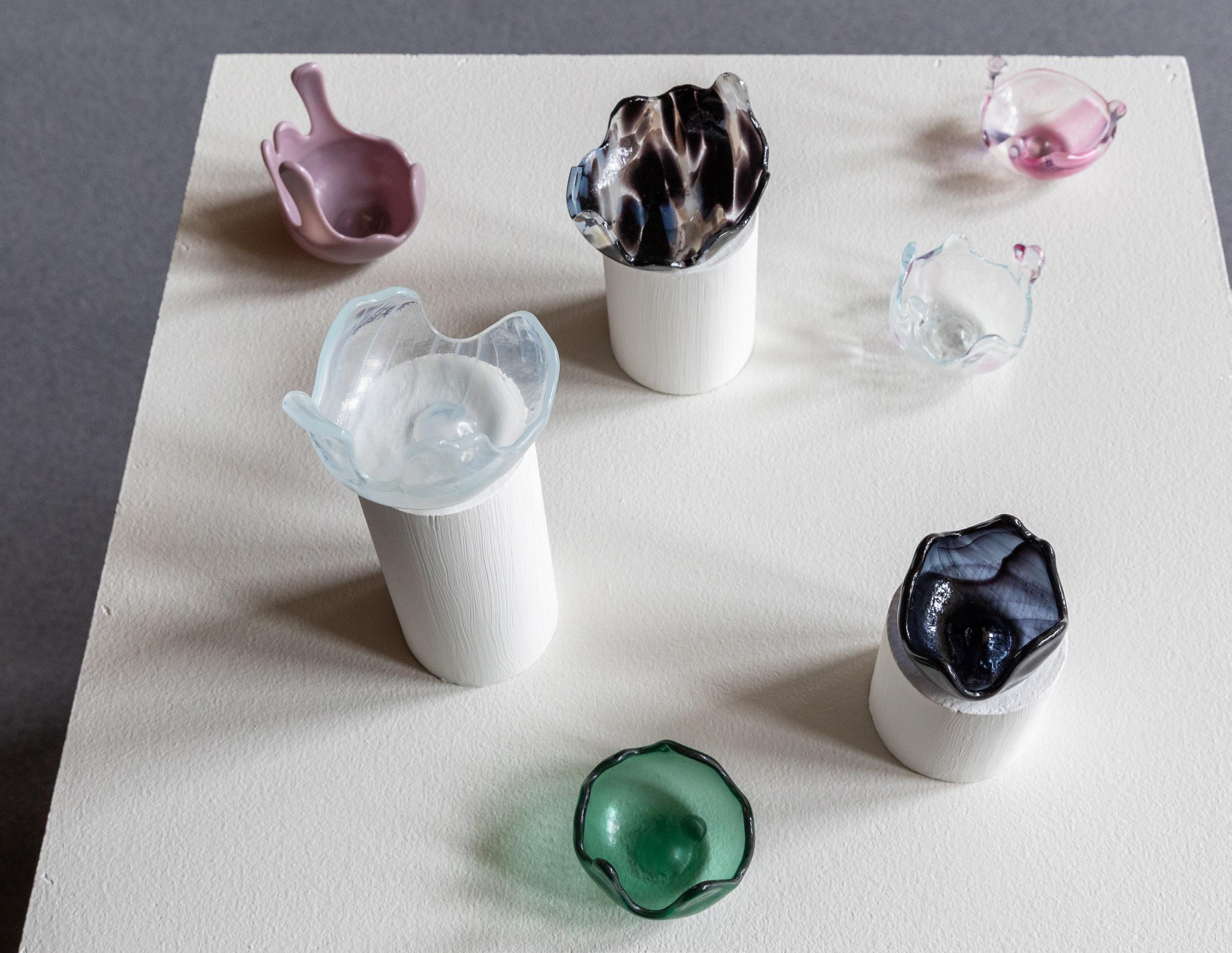 Lasin läpinäkyvyys muistuttaa myös hauraudesta, jota olen hakenut tehdessäni erilaisia tekniikkakokeiluja ohkaisilla puuvilla- ja pellavalangoilla. Virkkaamalla ylisuurella koukulla ohutta lankaa sain kudosmaisen herkän pinnan, joka yhdistyy kierrätetyn, sulatetun pullolasin läpikuultavuuteen.