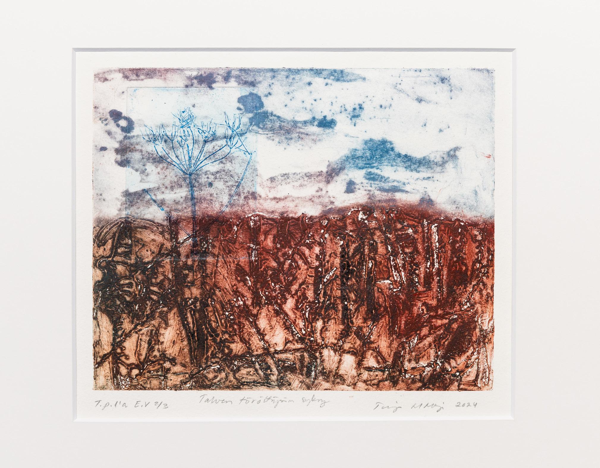 Olen tehnyt monoprint-teokset gelligrafiikalla, 240 g Canson-kartongille akryylimaalilla. Minua kiehtoo työprosessi, jonka tuloksena syntyy täysin uniikkeja vedoksia, ja jossa sattumalla on oma vaikutuksensa lopputulokseen. Painoprosessia voi varioida loputtomasti, eikä ole mahdollista tehdä kahta täysin samanlaista vedosta.