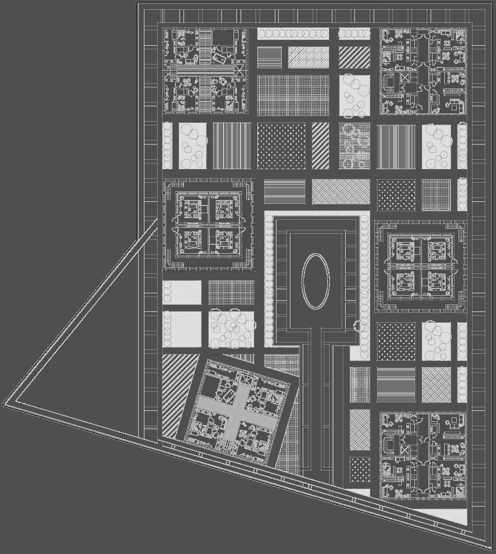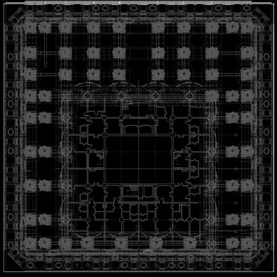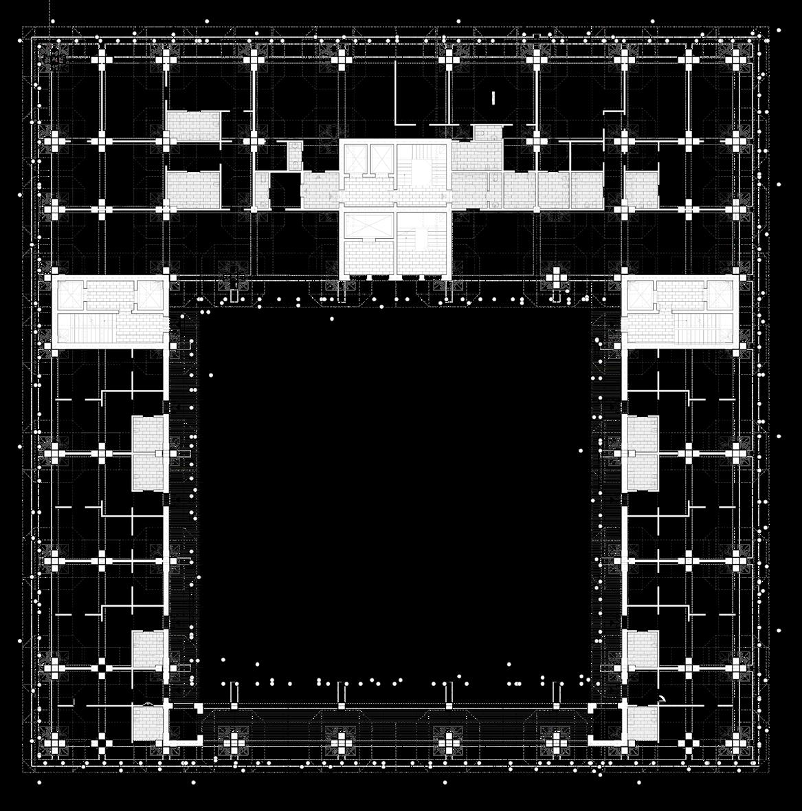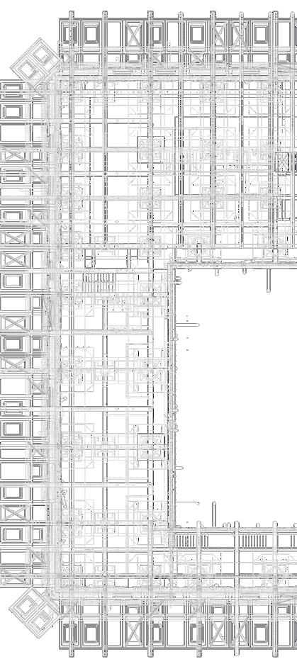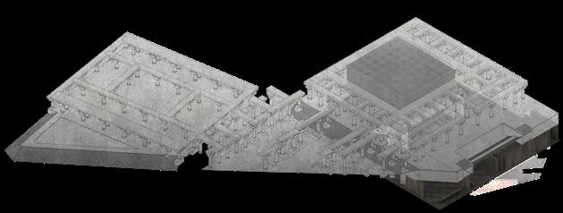 Thefullplanisbasedontheexistingcolumn grid,whichwascreatedatthestageofruin. Idon' tchangeormoveit;itremainsinits originalstate.AllofthespacesIdesignedin mybuildingarefoundedonthisgrid. Theinneryard,whichIusedasthesite forthetheatre,andtheinteriorspaces weredesignedbasedontheaxesandthe columns'shape.