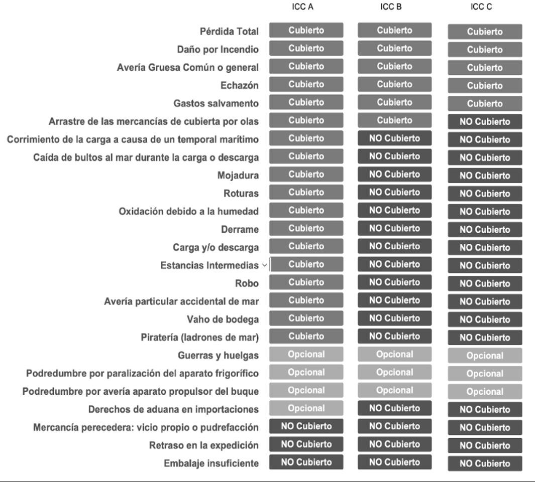 En estas tablas podemos ver las coberturas de la ICC para transporte aéreo, terrestre y finalmente el marítimo. Cada modo de transporte tiene sus propias coberturas.