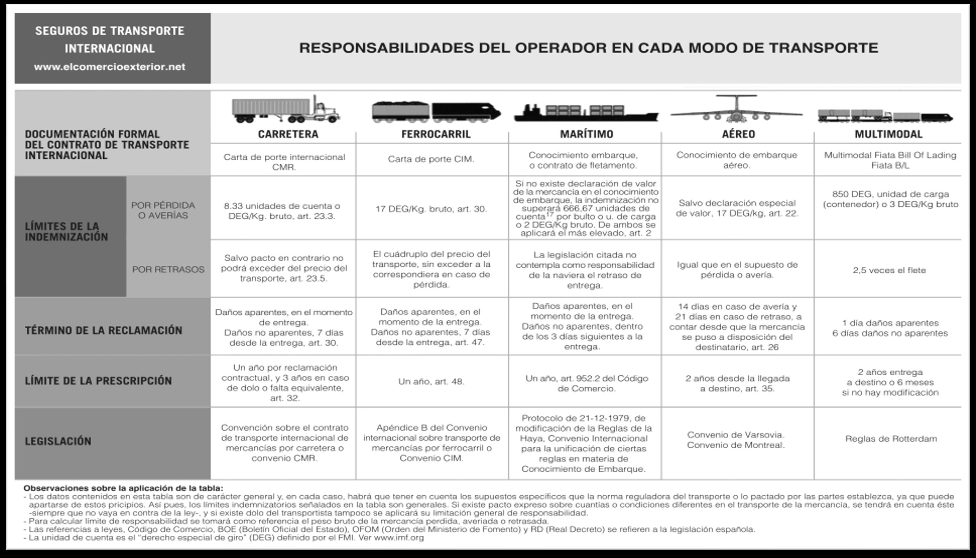 Asegurar la mercancía con los seguros obligatorios mínimos que establecen los convenios de transporte internacional. Existe la posibilidad de utilizar los seguros obligatorios de cada medio de transporte. No es un seguro obligatorio, sino que las empresas porteadoras pueden contratar un seguro de responsabilidad civil para cubrir el límite de responsabilidad legal, que deberían indemnizar como consecuencia del incumplimiento total o parcial del contrato de transporte. En la siguiente tabla podemos ver las responsabilidades del operador en cada modo de transporte donde se reflejan los límites de indemnización, los plazos de reclamación y cuándo prescriben estas reclamaciones para cada modo de transporte internacional.