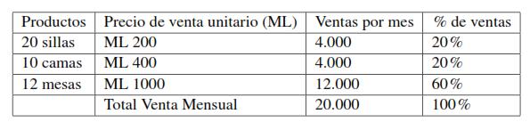 Total de ventas es ML20,000 de los cuales 20% son sillas, 20% camas y 60% mesas. Por lo tanto, 20% de los gastos generales pueden ser asignados a las sillas.