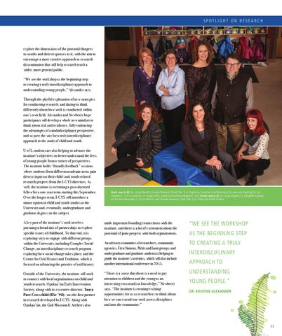 explore the dimensions of the potential dangers to youths and their responses to it, with the aim to encourage a more creative approach to research dissemination that will help research reach a wider, more general public. “We see the workshop as the beginning step to creating a truly interdisciplinary approach to understanding young people,” Alexander says. Through the playful exploration of new strategies for conducting research, and daring to think differently about how work is conducted within one’s own field, Alexander and Newberry hope participants will develop a whole new mindset to think about risk and resilience, fully embracing the advantages of a multidisciplinary perspective, and so pave the way for a truly interdisciplinary approach to the study of child and youth. U of L students are also helping to advance the institute’s objectives to better understand the lives of young people from a variety of perspectives. The institute holds “friendly feedback” sessions where students from different academic areas gain diverse input on their child- and youth-related research projects from the I-CYS directors. As well, the institute is recruiting a post-doctoral fellow for a one-year term starting this September. Over the longer term, I-CYS will introduce a minor option in child and youth studies at the University and, eventually, undergraduate and graduate degrees in the subject.