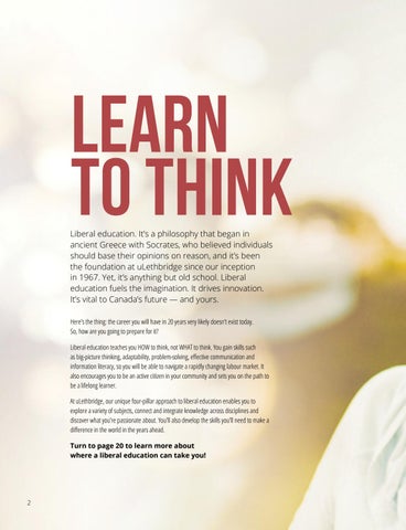 Liberal education. It’s a philosophy that began in ancient Greece with Socrates, who believed individuals should base their opinions on reason, and it’s been the foundation at uLethbridge since our inception in 1967. Yet, it’s anything but old school. Liberal education fuels the imagination. It drives innovation. It’s vital to Canada’s future — and yours. Here’s the thing: the career you will have in 20 years very likely doesn’t exist today. So, how are you going to prepare for it? Liberal education teaches you HOW to think, not WHAT to think. You gain skills such as big-picture thinking, adaptability, problem-solving, effective communication and information literacy, so you will be able to navigate a rapidly changing labour market. It also encourages you to be an active citizen in your community and sets you on the path to be a lifelong learner. At uLethbridge, our unique four-pillar approach to liberal education enables you to explore a variety of subjects, connect and integrate knowledge across disciplines and discover what you’re passionate about. You’ll also develop the skills you’ll need to make a difference in the world in the years ahead. Turn to page 20 to learn more about where a liberal education can take you!