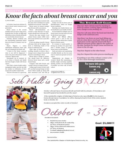 to get the community involved with the cause. Not to mention it is a great fundraiser for research,” Clark said. Breast cancer in women younger than 40 years old is uncommon. Breast self-examinations are crucial to early detection of cancer. women should start at the age of 20. Doctors also urge women to get clinical breast exams (CBE) every three years and then once a year after turning 40. If you are giving yourself a breast self-exam look out for lumps, hard knots or thickening inside of the breast or underarm area. Other signs of breast cancer are swelling, warmth or redness. Also a change in size or shape of one or both breasts is something to check. Breast tissue is lumpy in texture. One should know the difference between breast tissue and a newly formed lump. Compare with both breasts and consult a doctor if a lump is found. College aged women in their early 20’s can find unusual lumps in their breast which usually go along with their menstrual cycle and will go