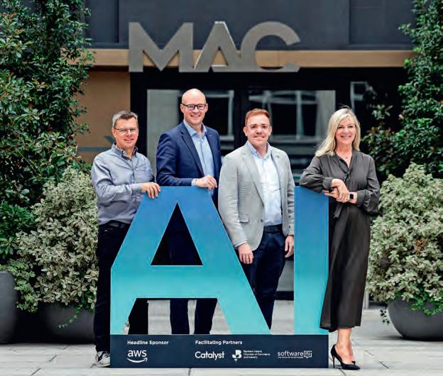 John Healy (Chair of the Board, FinTrU), Katrien Roppe (Chief of Staff, FinTrU), Kathleen McDermott (Executive Director, FinTrU), Greg McCann (Executive Director – North West Site Lead, FinTrU), Mayor Cllr Ruairí McHugh (Derry City and Strabane District Council), Minister Dr Caoimhe Archibald MLA (Department for the Economy), Darragh McCarthy (Founder & CEO, FinTrU), Richard McGuinness (Chief Operating Officer, FinTrU), Kathryn Harkin (Executive Director – Head of AI, FinTrU).