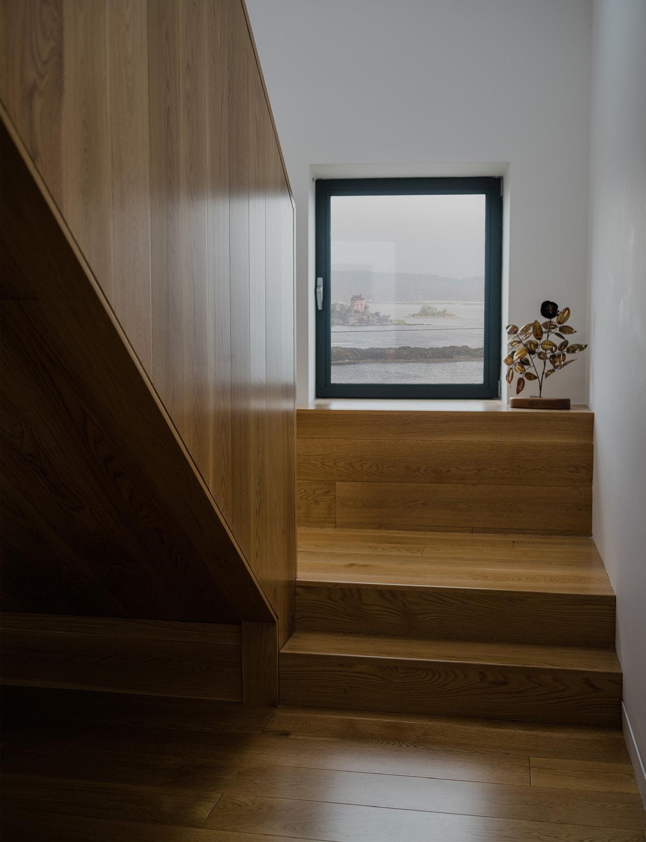 Both Cashel and Sámhnas overlook the water; their modest scale and sensitive design ensure a quiet and comfortable position within the landscape. They reflect Wright’s principles where the buildings extend naturally from their site reflecting the surrounding context, and where colour is referenced from those tones already visible in the environment. They further acknowledge McCormick’s signature design elements which ensure distinctive landscape features are reflected in the design, as well as integrating plain glass ‘picture windows’ to enable inhabitants to enjoy nature and light-filled homes. They are essentially objects in the landscape but designed to be sincere and in harmony with that context.