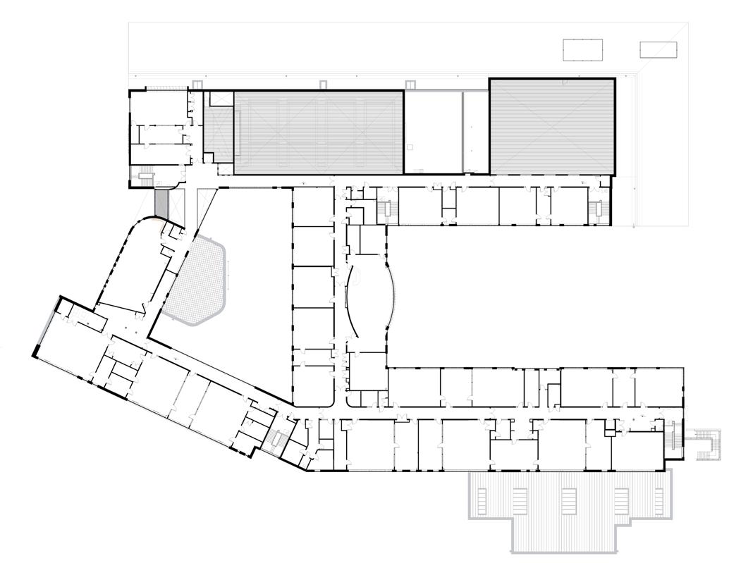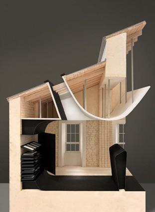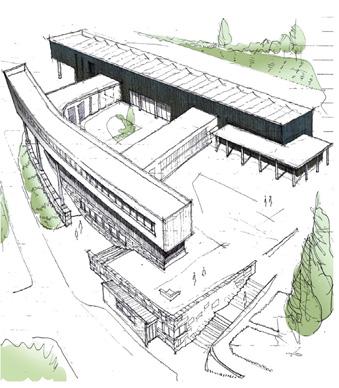of triangles in the roofscape and the scale of the chimney. It is a subtle aspect of continuity and one which may not have occurred to the architects when conceptualising their design. It is an apt connector however, as both structures are situated by the water. For the architects it was important that “the red roof in the landscape was in harmony with the red shed roofs that are visible in rural Donegal… it also has three distinct roof sections, echoing the natural rock formations along the coastline”.