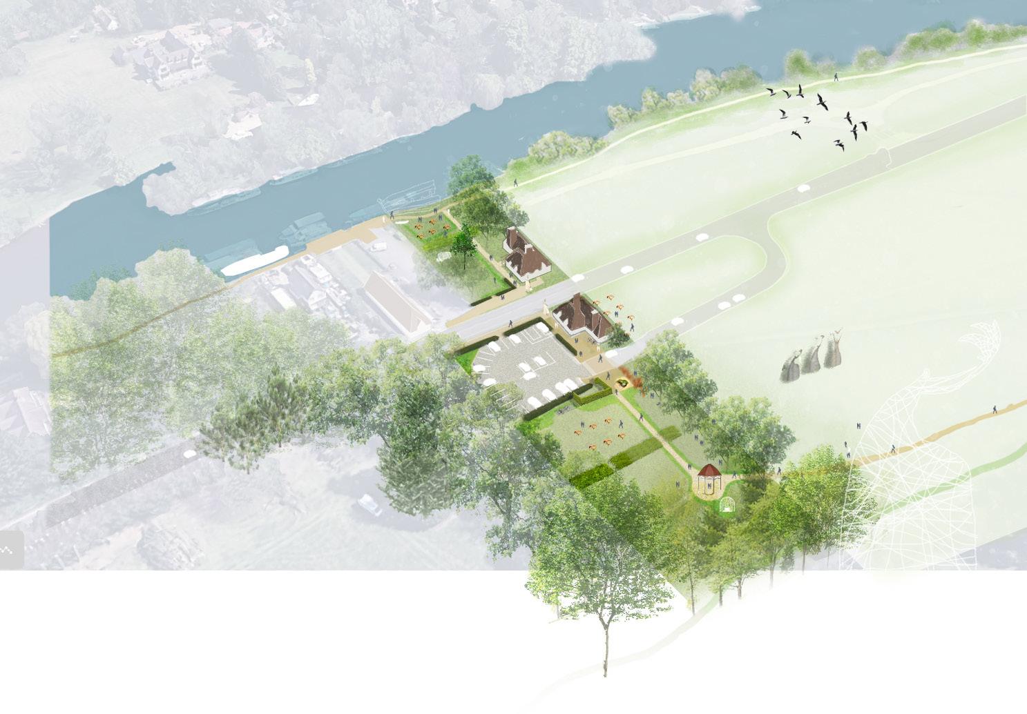 The masterplan that was developed provided a vision for the sites, encouraging connections to the adjacent town of Egham, with its rail and bus services, enabling reduced reliance on cars for access. An extension to the Thames Path facilitates wider walking and cycling connections and a proposed ferry, providing managed access to Ankerwycke. A legible network of routes around the sites, with associated interpretation and public art, was intended to encourage exploration, engagement and deeper understanding of its cultural and natural heritage, whilst safeguarding sensitive environments and managing visitor safety within the meadow environments where cattle are kept.