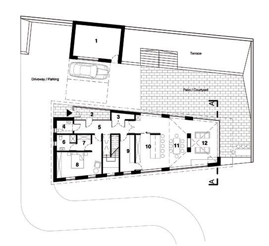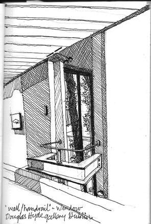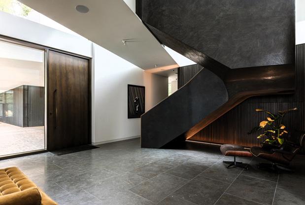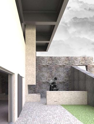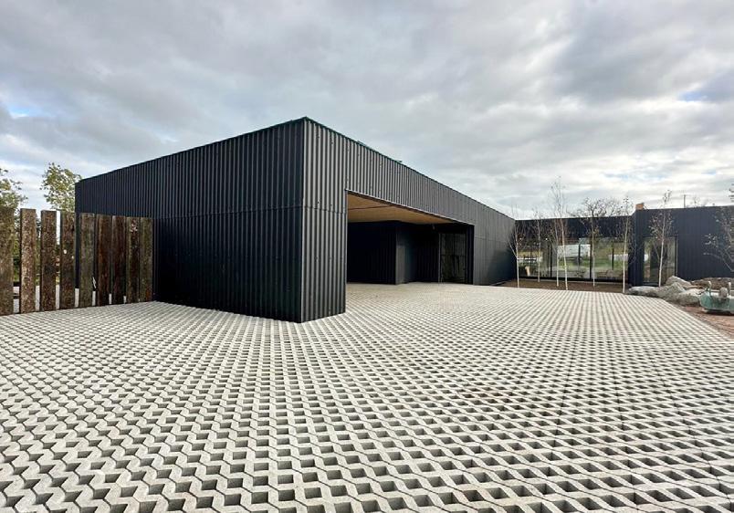 a simple monastic-style corridor. Similar to Cashel, rainwater collection is integrated into the design and the red rain spout channels storm water into a circular receptacle and this water is conserved and used domestically.
