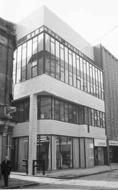 The building opened in 1968 to such success that, in 1970, the premises were extended to the rear, increasing the floor area by almost 50% and providing a similarly bold doubleheight shopfront to Garfield Street. Using the same material palette, the form here appears more functional and not as conceptually pure as the Royal Avenue elevation. When initially built, the upper floors took the form of a monolithic