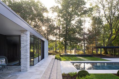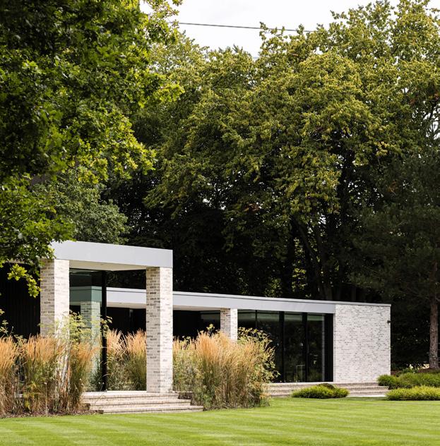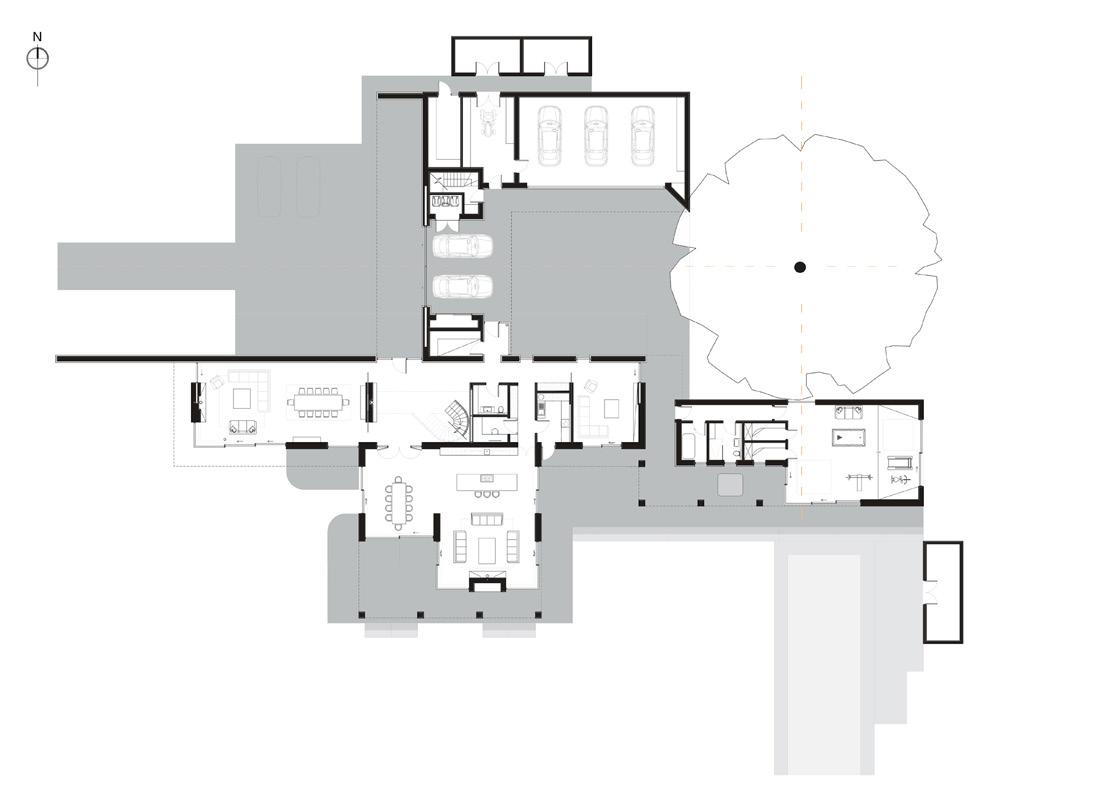 an expanded floor area at the east end of the property, which accommodates the master bedroom, en suite bathroom and additional bathroom on the ground floor, and at first-floor level, a study, bedroom and comms/plant room. At the west end, a double-height living and dining area is located, and this space communicates with an adjacent patio area, accessed via glazed doors. A dialogue is established between internal and external spaces via the continuous levels, glazing on the west elevation and the roof that extends over a portion of the patio space. Within this extended roofscape the timber soffit is exposed; its treatment is a nod to the roof interior of St. Conal’s Church in Glenties (1974) by Liam McCormick. There is further continuity with McCormick in MacGabhann Architects’ use of white wet dash and downpipes conceived as abstracted gargoyles on either corner of the east elevation to bring water down from the roof into two circular receptacles. The closest McCormick referent for this feature is the Church of St. Aengus in Burt with its rainwater spout delivering water to a circular pool at ground level. The symmetry of these spouts and receptacles acts as a grounding device for the house on its site.
