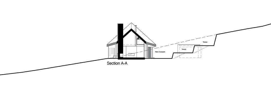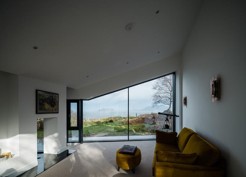 There was an existing cottage on the site and the design of the new build sees its footprint extended and fanned out through adding two wings. This opens the house to the seascape and Malin Head beyond. The form of the house is that of single-roomdeep traditional cottages and the small gable end of the building reflects this scale, ensuring continuity with tradition while also providing privacy. The house essentially has two distinct aspects: that of the south elevation where the vernacular is evidenced but given a contemporary dimension of a sloped soffit of timber painted black. This overhang provides shelter and is partially supported by the living-area wing of the structure. Within, the interior is centred on multi-generational living. The kitchen and dining area adjoins the living area on a higher level and there is a soft demarcation of these spaces through incorporation of a dividing wall with an opening for the stove that shares heat throughout this combined space. Bedrooms are accessed via