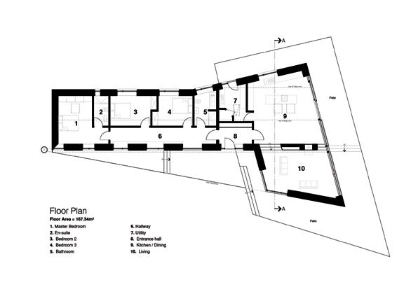 The footprint of the house is shaped as an elongated isosceles trapezoid, or wedge-shape rectangle. This creates