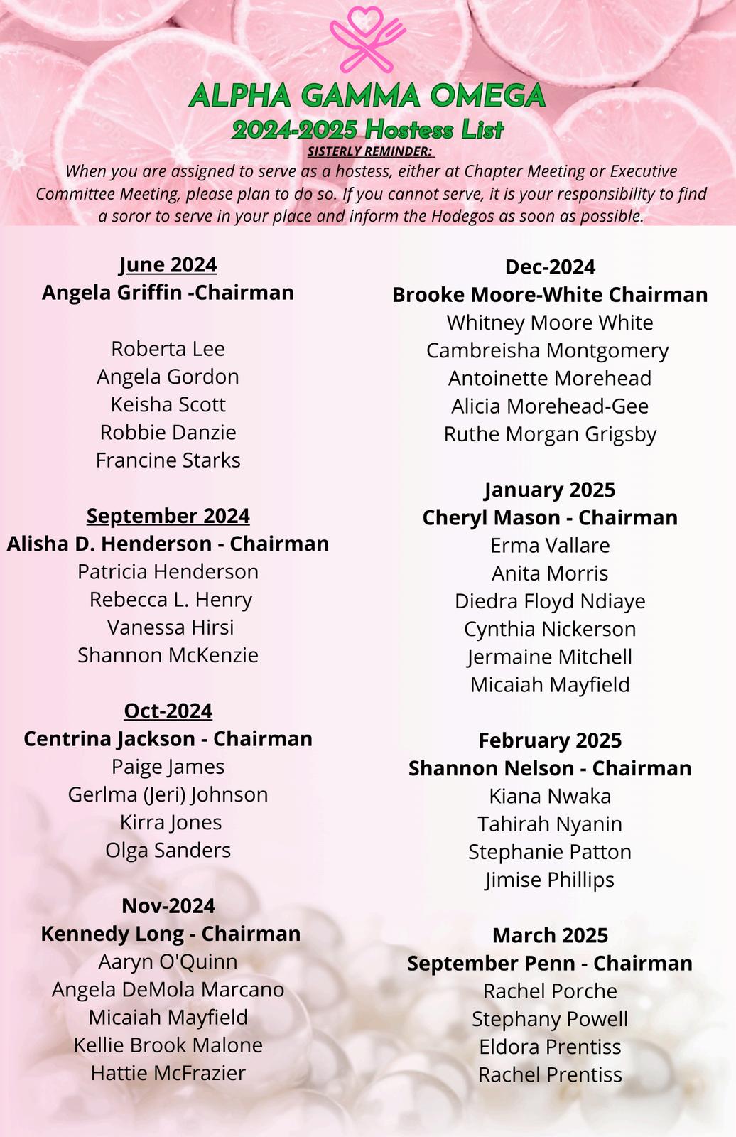 I appreciate the dedication of our Officers, Chairman, Co-Chairman and chapter members as we carry out the plans and goals we have set for our chapter. Thank you for serving Alpha Gamma Omega and making it an Awesome, Glamorous, and Oh So Pretty chapter who produces Outstanding work!