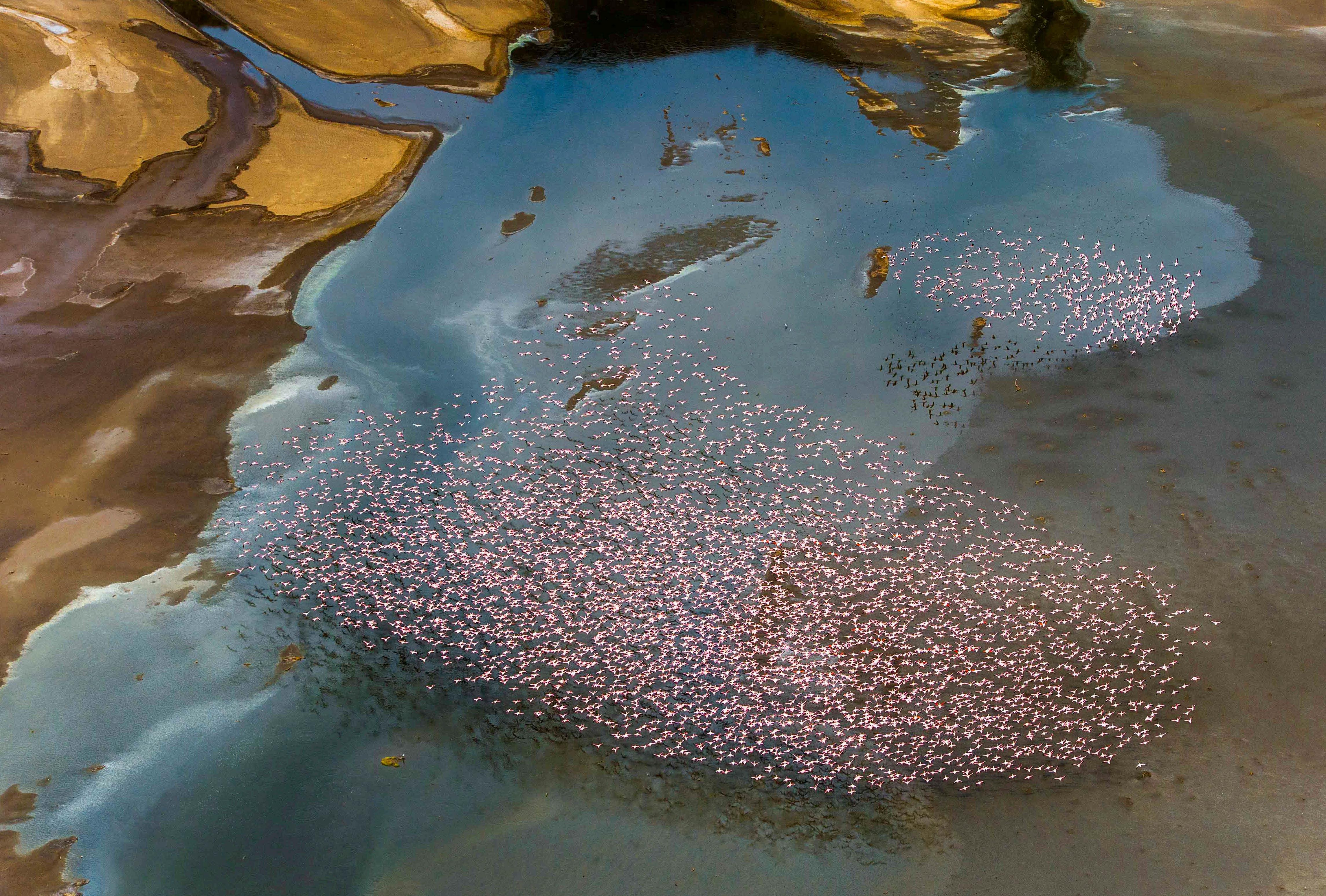 mind: a colony of some two million paints the shoreline a hazy pink, and flocks above it in vibrant formation.