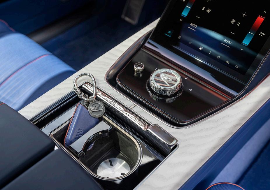 and airy, thanks to its gorgeous electrochromatic glass roof, and feels minimalist in a glamorous yet cool midcentury modern way. It would look the part parked up in front of one of E. Stewart Williams’ Palm Springs homes, with the ghost of Frank Sinatra kicking the tyres. Many of the metal instruments have been 3D printed, while the fabrics are of very high quality but not weighty and suffocating like those of a Bentley. The dash is a massive single-piece 55in screen like Mercedes’ Hyperscreen, but it’s less gaudy and distracting. The rear passengers get screens too, so no one needs to talk to each other. And its 38-speaker AKG stereo with 3D surround sound will leave you deaf, anyway.
