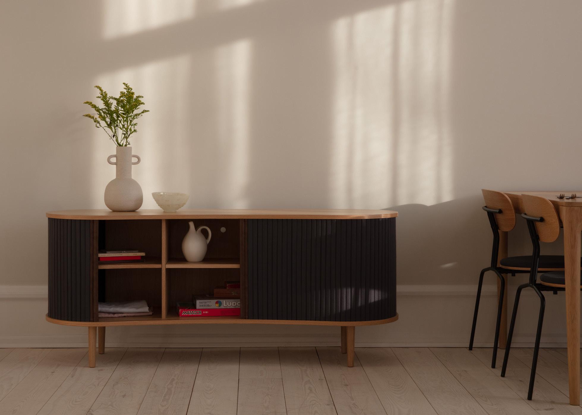 Treasures is a customisable cabinet with a Nordic expression. The cabinet is made from veneered oak and the curved sides of the cabinet have a customisable covering that gives Treasures a soft, tactile touch.