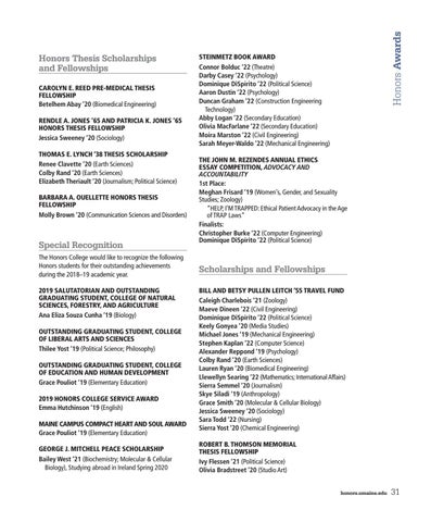 CAROLYN E. REED PRE-MEDICAL THESIS FELLOWSHIP Betelhem Abay ‘20 (Biomedical Engineering) RENDLE A. JONES ’65 AND PATRICIA K. JONES ’65 HONORS THESIS FELLOWSHIP Jessica Sweeney ‘20 (Sociology) THOMAS E. LYNCH ‘38 THESIS SCHOLARSHIP Renee Clavette ‘20 (Earth Sciences) Colby Rand ‘20 (Earth Sciences) Elizabeth Theriault ‘20 (Journalism; Political Science) BARBARA A. OUELLETTE HONORS THESIS FELLOWSHIP Molly Brown ‘20 (Communication Sciences and Disorders)